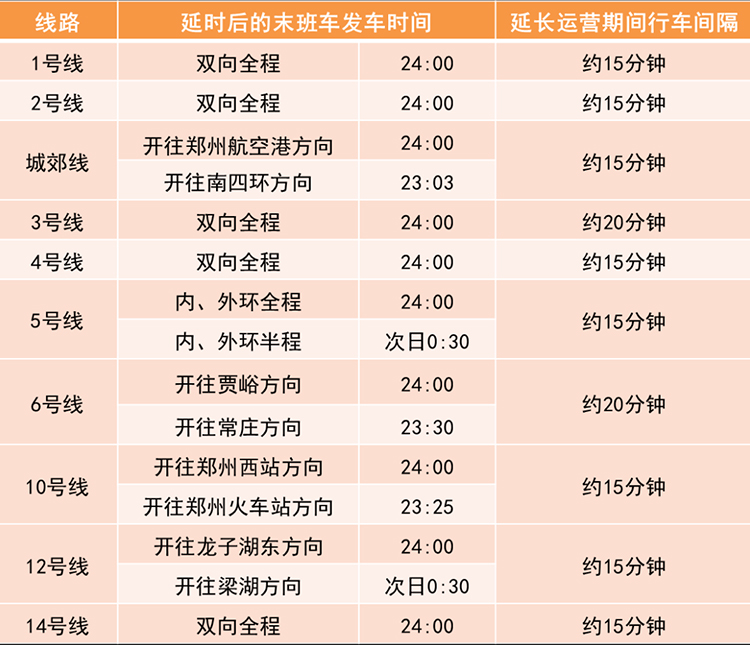 2月24日(元宵節(jié)當(dāng)天),鄭州地鐵線網(wǎng)總體延長(zhǎng)運(yùn)營(yíng)服務(wù)時(shí)間至24:00,